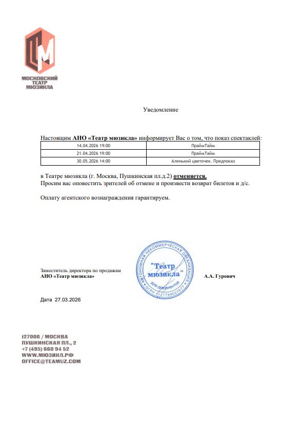 Уважаемый клиент! Спешим сообщить, что по информации, полученной от организатора, мюзикл «Аленький цветочек». Предпоказ, запланированный на 30 мая 2026 года в 14:00 в Театре мюзикла, отменён. Деньги за электронные билеты вернутся автоматически в полном объёме на карту, с которой была произведена оплата. Если вы купили билет в кассе Ticketland.ru за наличный расчет или оплатили подарочной картой, то обратитесь, пожалуйста, на почту: vozvrat@ticketland.ru. С уважением, команда поддержки Ticketland.