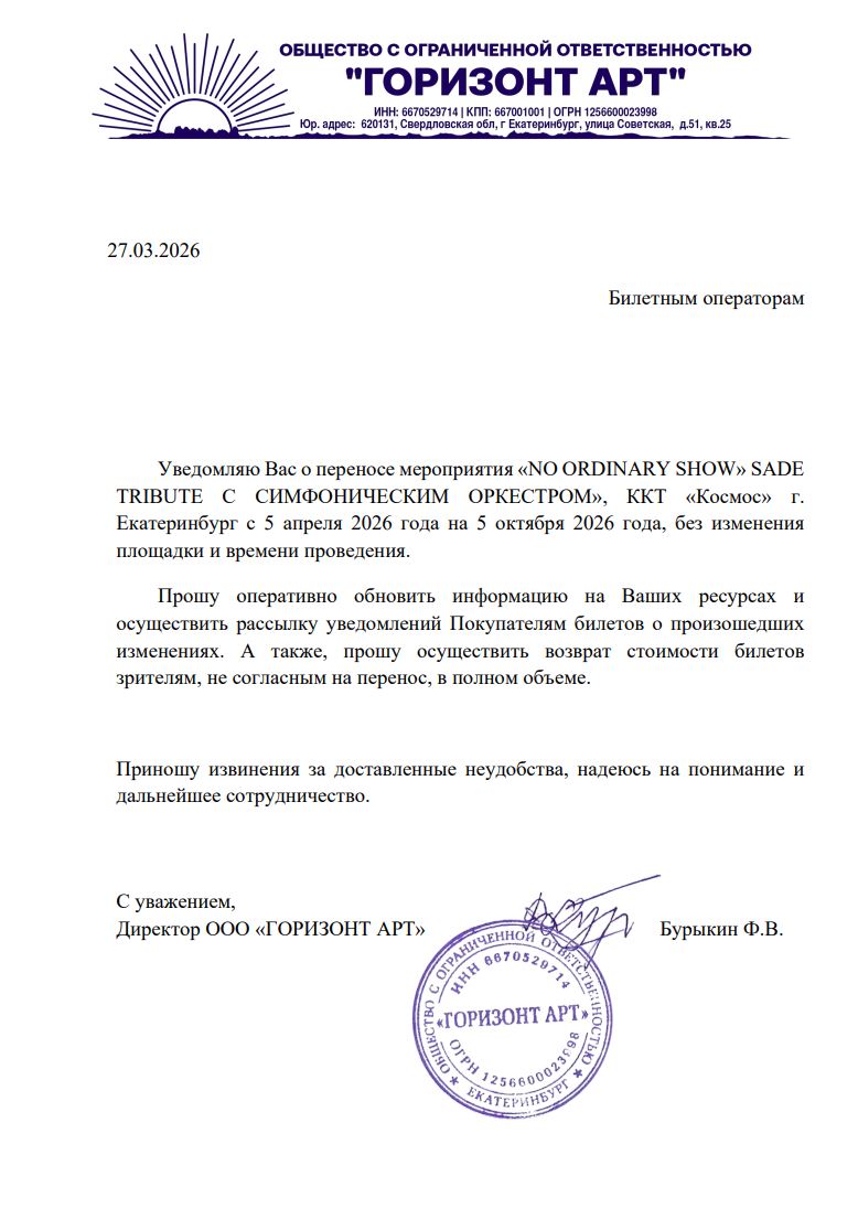Уважаемый клиент! Спешим сообщить, что по информации, полученной от организатора, концерт «No ordinary show» sade tribute с оркестром», запланированный на 5 апреля 2026 года в 19:00 в Киноконцертном театре «Космос», перенесён на 5 октября 2026 года, начало в 19:00. Ранее приобретенные билеты действительны на новую дату, обменивать их не нужно. Если вам не удобно посетить мероприятие, вы можете вернуть билет по кнопке в личном кабинете во вкладке «Заказы». Деньги за электронные билеты вернутся автоматически в полном объёме на карту, с которой была произведена оплата. Если вы купили билет в кассе Ticketland.ru за наличный расчет или оплатили подарочной картой , то обратитесь, пожалуйста, на почту: vozvrat@ticketland.ru. С уважением, команда поддержки Ticketland