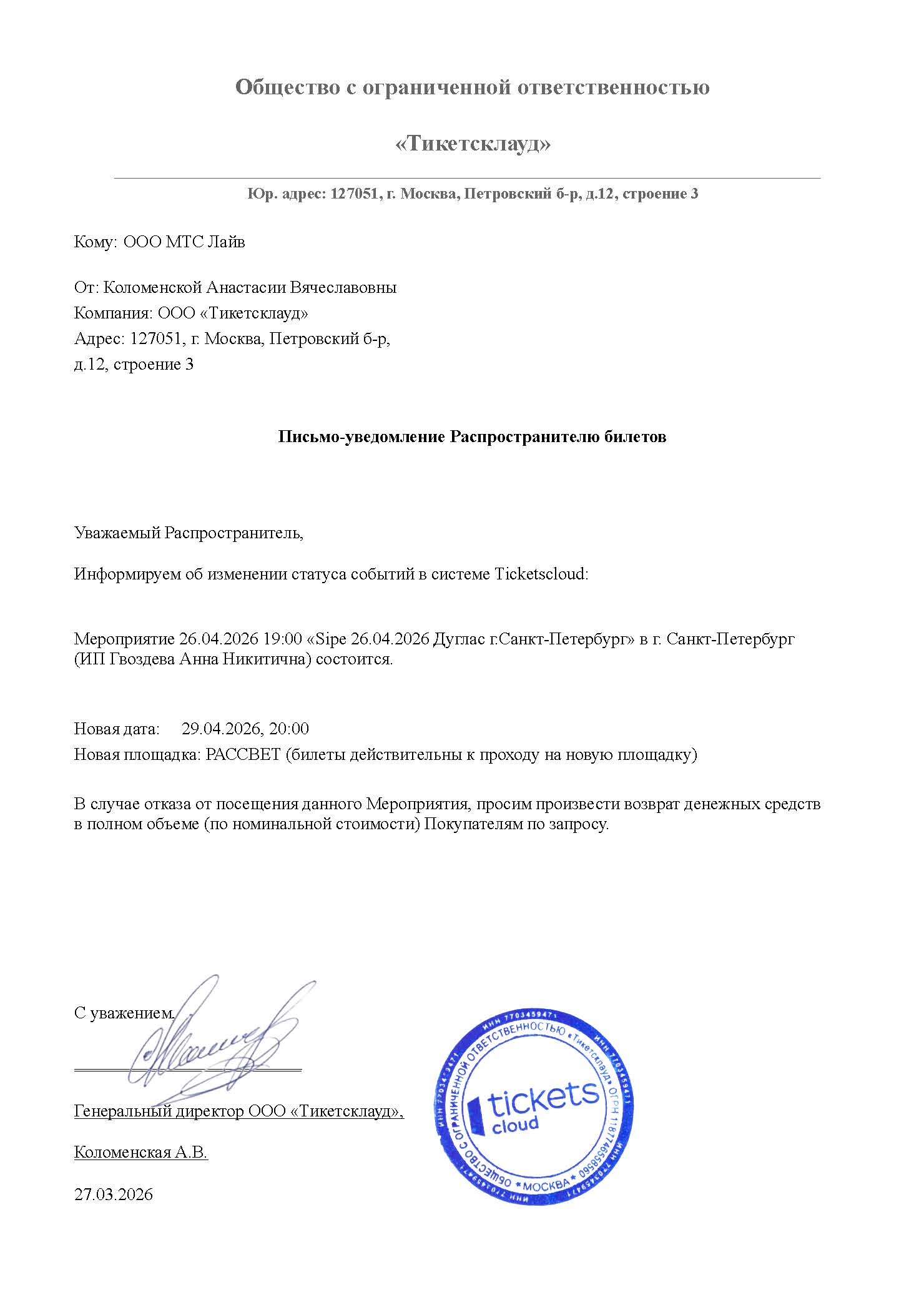 Уважаемый клиент! Спешим сообщить, что по информации, полученной от организатора, концерт группы «Tritia», запланированный на 27 сентября 2025 года (перенос с 2 апреля 2025 года) в Dom печати, перенесен на 3 мая 2026, начало в 20:00 на площадку MusicHall27 по адресу: г. Уфа, улица Кирова, дом 27. Ранее приобретенные билеты действительны на новую дату, обменивать их не нужно. Если вам не удобно посетить мероприятие в новую дату, вы можете вернуть билет по кнопке в личном кабинете во вкладке «Заказы». Деньги за электронные билеты вернутся автоматически в полном объёме на карту, с которой была произведена оплата. Если вы купили билет в кассе Ticketland.ru за наличный расчет, то обратитесь, пожалуйста, на почту: vozvrat@ticketland.ru. С уважением, команда поддержки Ticketland