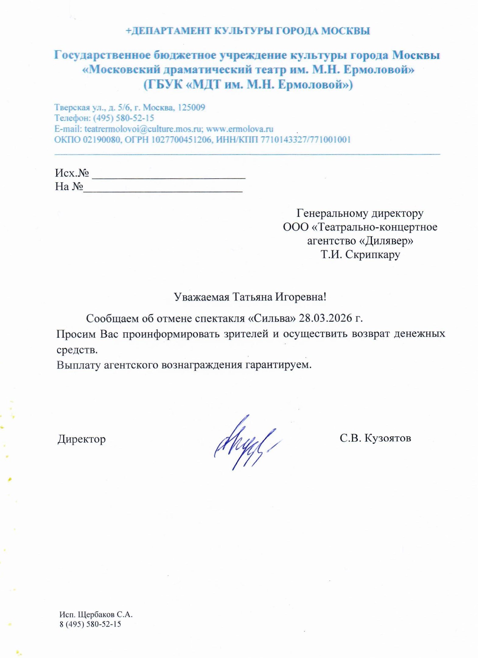 Уважаемый клиент! Спешим сообщить, что по информации, полученной от организатора, спектакль «Сильва», запланированный на 28 марта 2026 года в 19:00 в Театре им. М. Н. Ермоловой, отменён. Деньги за электронные билеты вернутся автоматически в полном объёме на карту, с которой была произведена оплата. Если вы купили билет в кассе Ticketland.ru за наличный расчет или оплатили подарочной картой, то обратитесь, пожалуйста, на почту: vozvrat@ticketland.ru. С уважением, команда поддержки Ticketland.