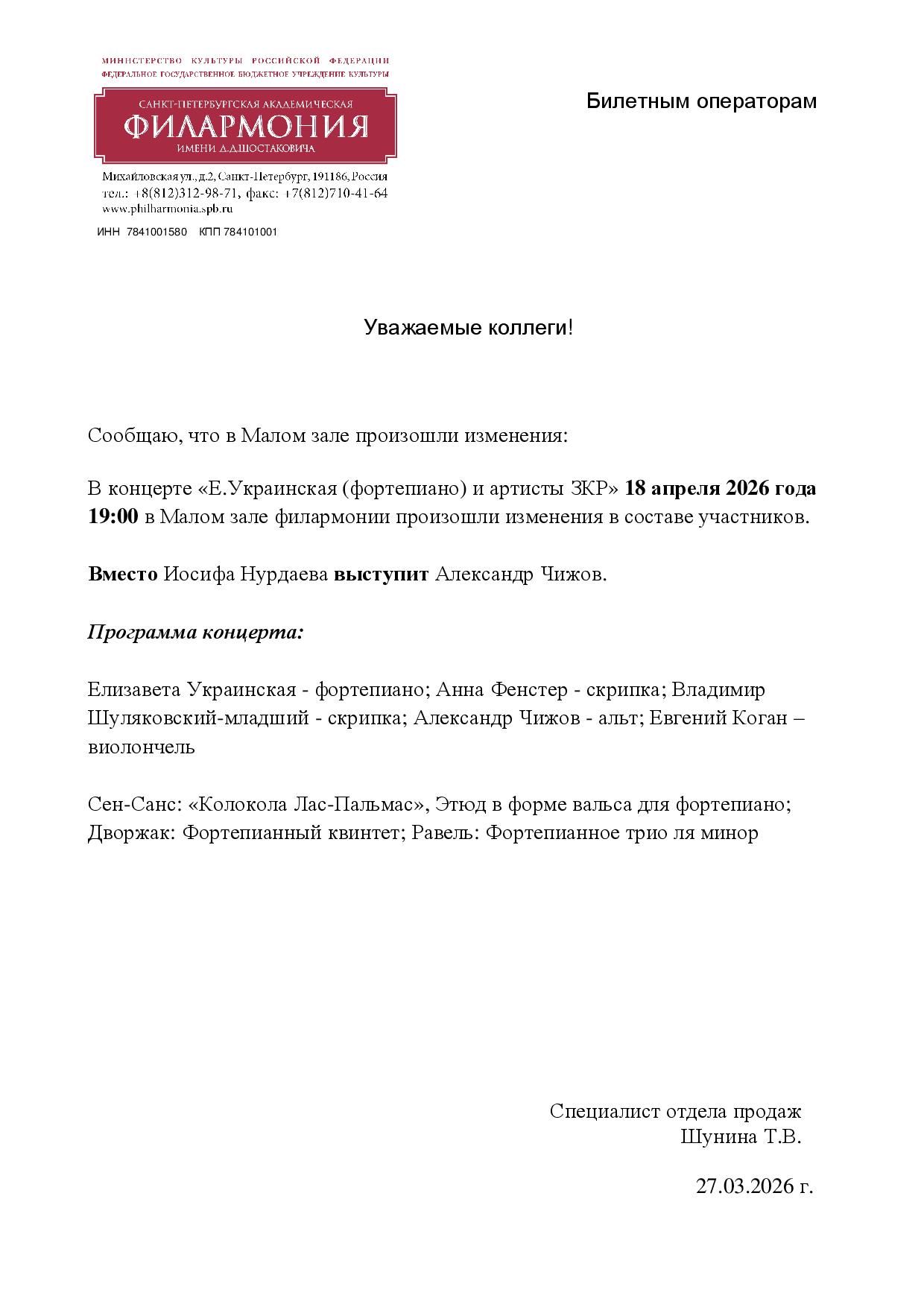 Уважаемый клиент! Спешим сообщить, что по информации, полученной от организатора, в программе концерта «Е. Украинская (фортепиано) и артисты ЗКР, аб-т №1», запланированного на 18 апреля 2026 года в 19:00 в Филармонии (Малый зал), произошли изменения в составе участников. Вместо Иосифа Нурдаева выступит Александр Чижов. Ранее приобретенные билеты действительны, обменивать их не нужно. Если вам не удобно посетить мероприятие, вы можете вернуть билет по кнопке в личном кабинете во вкладке «Заказы». Деньги за электронные билеты вернутся автоматически в полном объёме на карту, с которой была произведена оплата. Если вы купили билет в кассе Ticketland.ru за наличный расчет, то обратитесь, пожалуйста, на почту: vozvrat@ticketland.ru. С уважением, команда поддержки Ticketland