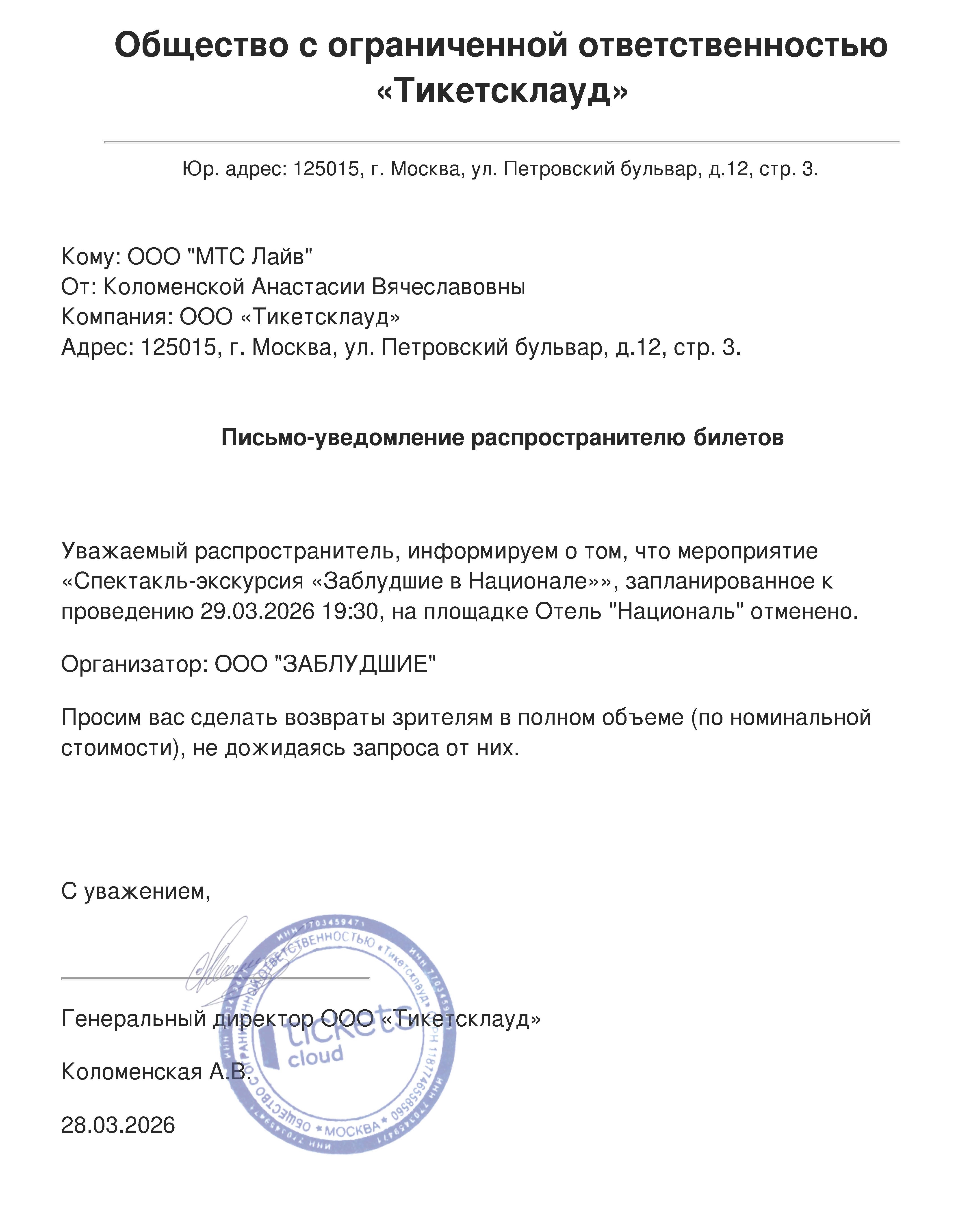 Уважаемый клиент! Спешим сообщить, что по информации, полученной от организатора, спектакль-экскурсия «Заблудшие в Национале», запланированный на 27 марта 2026 года в 19:30 в отеле «Националь», перенесён на 17:30. Если вам не удобно посетить мероприятие в новое время, вы можете вернуть билет по кнопке в личном кабинете во вкладке «Заказы» (до 27.03.2026 17:30). Деньги за электронные билеты вернутся автоматически в полном объёме на карту, с которой была произведена оплата. Если вы купили билет в кассе Ticketland.ru за наличный расчет или оплатили подарочной картой , то обратитесь, пожалуйста, на почту: vozvrat@ticketland.ru. С уважением, команда поддержки Ticketland