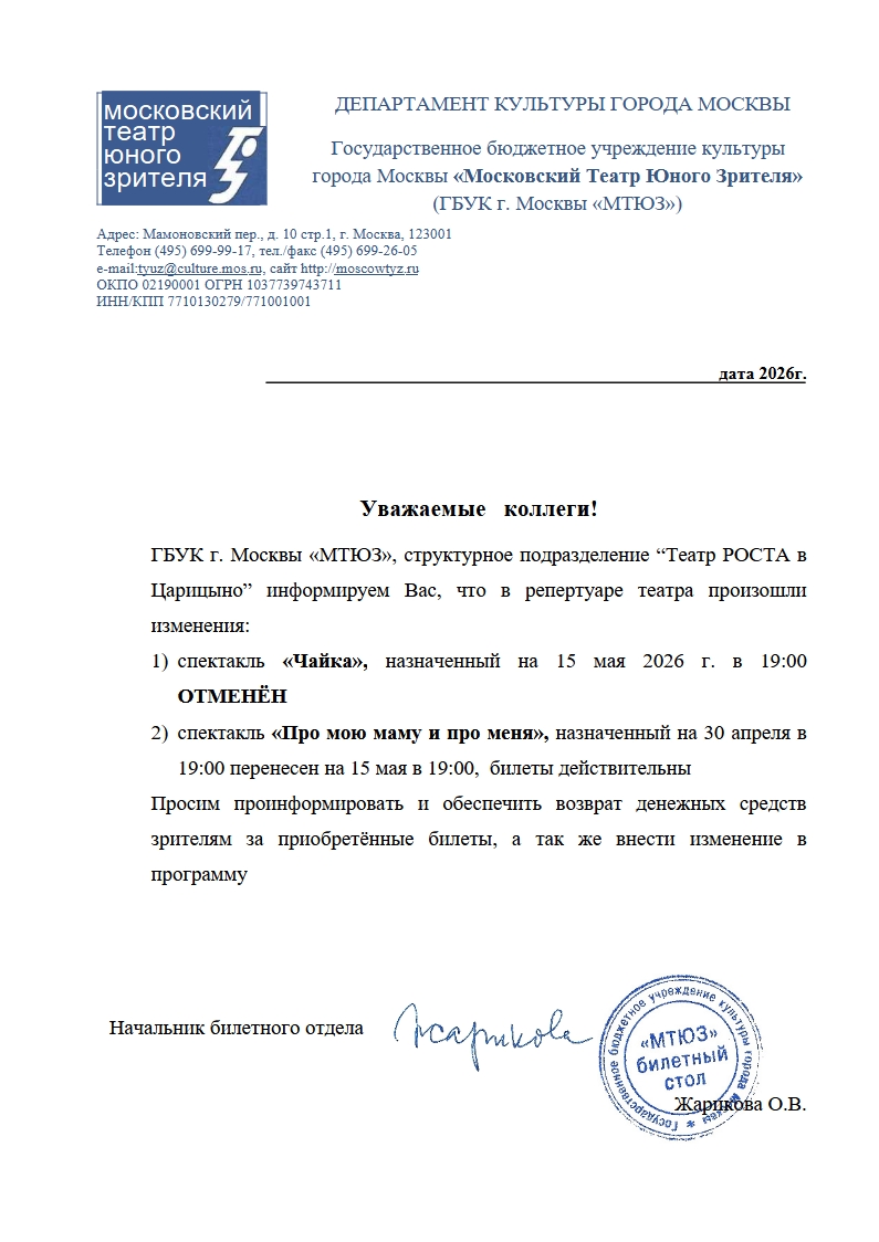Уважаемый клиент! Спешим сообщить, что по информации, полученной от организатора, спектакль «Про мою маму и про меня», запланированный на 30 апреля 2026 года в 19:00 в ГБУК МТЮЗ подразделение «Театр РОСТА» в Царицыно», перенесён на 15 мая 2026 года, начало в 19:00. Ранее приобретенные билеты действительны на новую дату, обменивать их не нужно. Если вам не удобно посетить спектакль в новую дату, вы можете вернуть билет по кнопке в личном кабинете во вкладке «Заказы» (до 30 апреля 2026 года до 19:00). Деньги за электронные билеты вернутся автоматически в полном объёме на карту, с которой была произведена оплата. Если вы купили билет в кассе Ticketland.ru за наличный расчет или оплатили подарочной картой, то обратитесь, пожалуйста, на почту: vozvrat@ticketland.ru. С уважением, команда поддержки Ticketland.